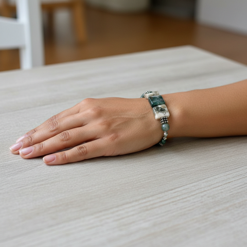 Ocean Jasper square stones, with dark green and white swirls, each one having its own unique pattern, pair with Moss Agate and silver beads. Suede and Thai Hill Tribe closure bead. Sterling silver clasp and ring.