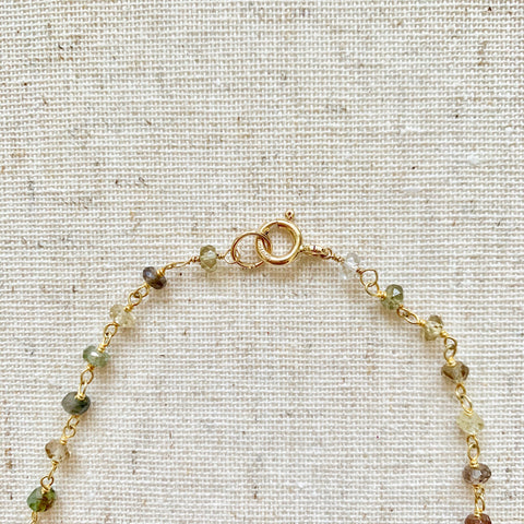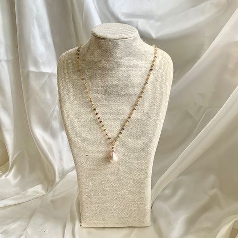 An enchanting opalescent, peachy pink Baroque Pearl is pairs with a strand of sparkly Umba Sapphires, in earthy tones of light greens, browns, and yellows. 14kt gold-filled spring ring clasp. 24". Please note, Umba Sapphires are natural, not treated and each Bella is unique so colors may vary.