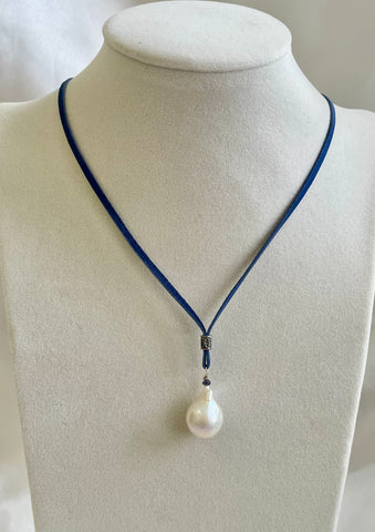 Striking baroque Pearl with blue suede, accented with Thai Hill Tribe silver beads. Adjustable.