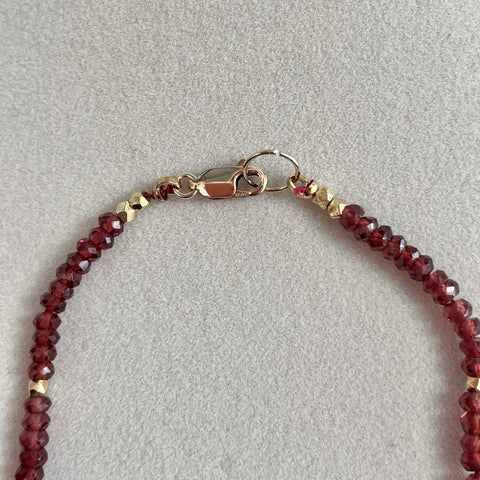 Fiery Ethiopian Opal flashes red and greens, show off paired with deep wine red Garnets. Strung on silk thread. 14kt gold filled lobster clasp and ring.