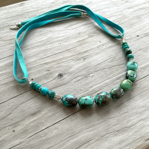 Each richly colored stone in this necklace has its own unique pattern. For each of my turquoise Centered necklaces, I carefully choose a group of turquoise stones that complement each other in color, pattern & placement. Accented with silver beads from Thailand. Natural suede and Sterling Silver hook & eye clasp.